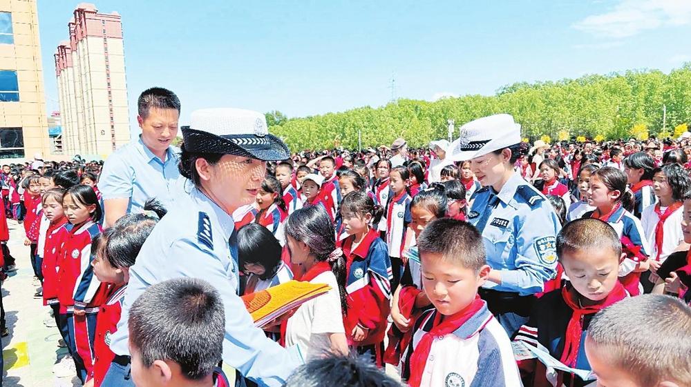 民警向?qū)W生發(fā)放宣傳資料。6月26日,積石山縣公安局交警大隊(duì)民警走進(jìn)城西小學(xué),開展“知危險(xiǎn)會(huì)避險(xiǎn)”交通安全宣傳教育活動(dòng),給學(xué)生們上了一堂暑期交通安全課。 新甘肅·甘肅法治報(bào)通訊員趙小紅攝