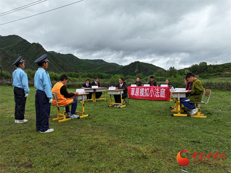 “現(xiàn)在開庭,帶被告人進(jìn)場(chǎng)。”勒秀鎮(zhèn)草原上,由甘南州檢察院、合作市檢察院精心指導(dǎo)的模擬法庭在風(fēng)景如畫的草原展開,法官、公訴人、辯護(hù)律師、法警、被告人都由勒秀鎮(zhèn)中心小學(xué)的學(xué)生飾演。