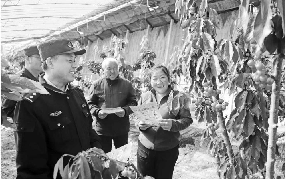 3月10日,西峰公安分局顯勝派出所民警走進(jìn)櫻桃大棚開(kāi)展食品安全宣傳活動(dòng)。新甘肅·甘肅法治報(bào)通訊員 左棟 攝