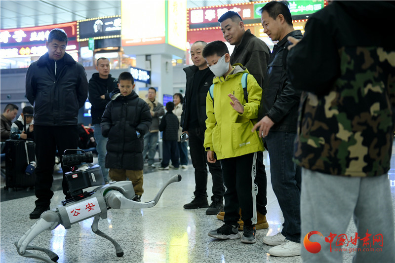 蘭州西站派出所民警利用機(jī)器犬開(kāi)展治安巡邏防范、法治宣傳等各項(xiàng)工作