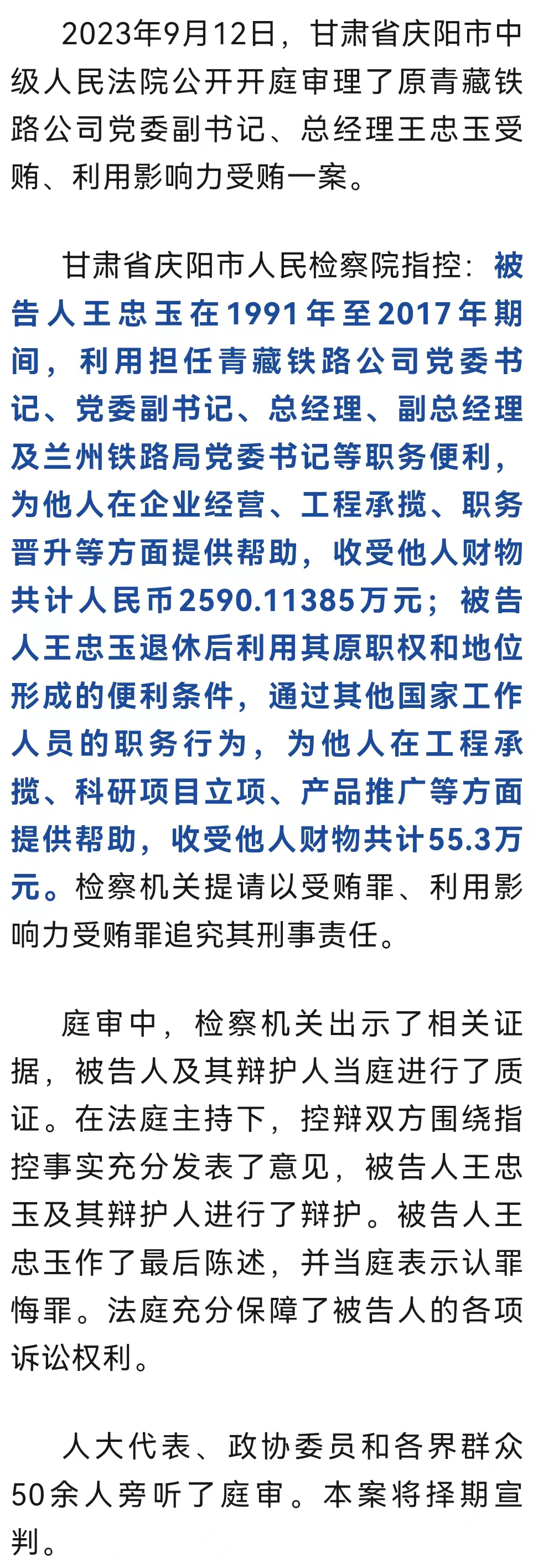 收受他人財物2600多萬元!原青藏鐵路公司黨委副書記、總經(jīng)理王忠玉案一審開庭