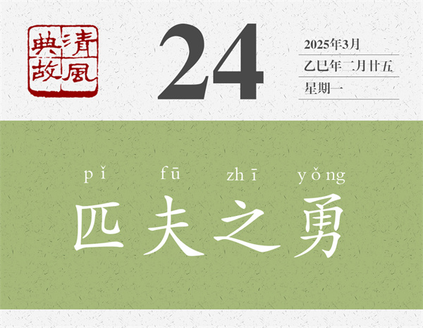 “匹夫”指平民百姓,也指平常人、一般人。起碼在孔子那里,還沒有貶義?!墩撜Z·子罕》:“子曰:‘三軍可奪帥也,匹夫不可奪志也。’”在韓非那里也一樣,《韓非子·有度》:“刑過不避大臣,賞善不遺匹夫。”但典出《國語》的“匹夫之勇”則用來指稱毫無智謀,單憑一己之力蠻干的勇氣,已經(jīng)沒有任何褒義了?!睹献?middot;梁惠王下》:“王請無好小勇。夫撫劍疾視曰,‘彼惡敢當(dāng)我哉!’此匹夫之勇,敵一人者也。”孟子將“匹夫之勇”稱為“小勇”。蘇軾《留侯論》:“匹夫見辱,拔劍而起,挺身而斗,此不足為勇也。”蘇軾則將“匹夫之勇”視為“不足為勇”。