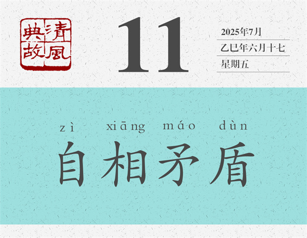 “自相矛盾”的本義是,不管是自己的矛刺穿了自己的盾,還是自己的盾無(wú)法被自己的矛刺穿,都會(huì)陷入不能自圓其說(shuō)的難堪境地。后人則以“自相矛盾”為典,比喻一個(gè)人前面說(shuō)的和后面說(shuō)的、前面做的和后面做的相互抵觸,或者自己所說(shuō)與所做、自己所為與所述互相沖突。也指同一機(jī)關(guān)、同一機(jī)構(gòu)中各個(gè)部門、各個(gè)成員之間說(shuō)法不統(tǒng)一,行為不一致。宋人王觀國(guó)《學(xué)林·言行》:“圣賢言行,要當(dāng)顧踐,毋使自相矛盾。”