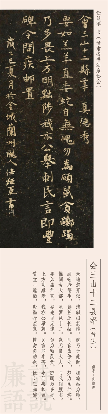公元1232年,南宋官員真德秀到福州擔(dān)任知府,到任后把下轄12個縣的知縣召集在一起集體談話,擺事實、講道理,談廉政、申紀(jì)律,事后將談話內(nèi)容寫成了詩,就是今天我們看到的這首作品。這是一首五言敘事詩,長達(dá)250字,這里我們節(jié)選后半部分。