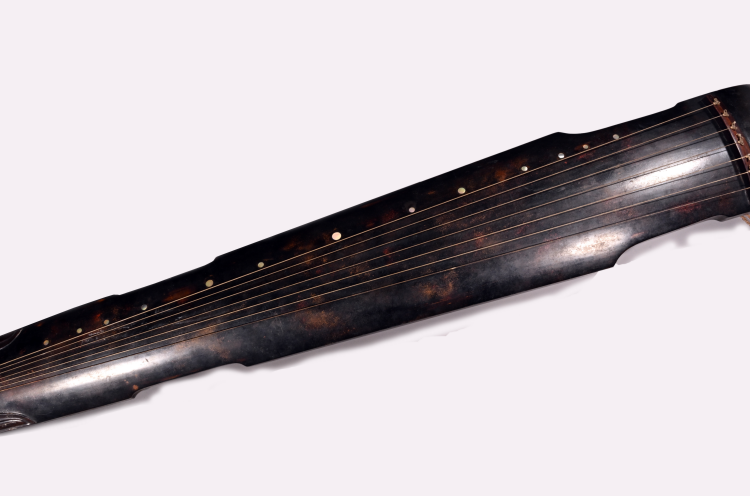 明代,通長124.5厘米,琴額寬17.3厘米,琴肩寬21厘米,琴尾寬13厘米,形制為仲尼式,琴面為梧桐木,通體呈深栗色。護軫為卷角飾,弦軫為紅木制成。琴腹龍池上方鐫刻篆書詩一首“空山無人,鳴泉幽咽,歸從舒音,淖猨司鈴”,共16字,落款為“鄭世子”。池下沼上鐫刻方形篆書印章一方,為“鄭學圖書”??谈箍?ldquo;大明萬歷十年歲次壬午二月吉旦,鄭世子載堉按太簇尺造”。朱載堉是明代杰出律學家、歷算家,首創(chuàng) “十二平均律”,在音樂、數學、天文等領域均有重大建樹。