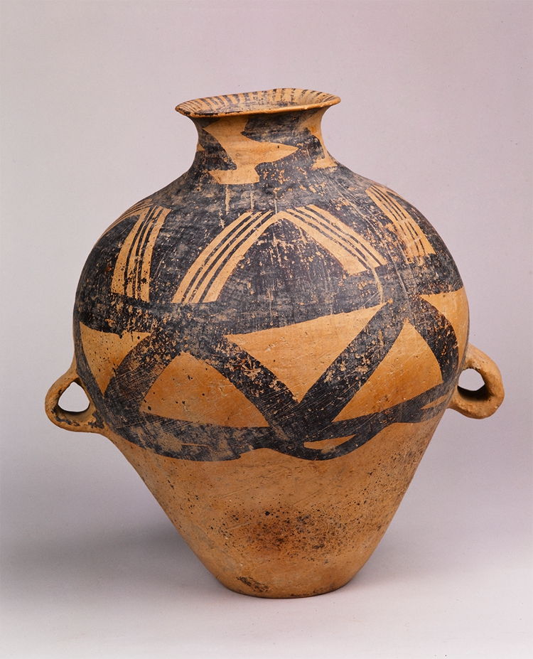 馬家窯文化馬廠類型,高37厘米,底徑10厘米。侈口,短頸,圓肩鼓腹,下腹內(nèi)收,平底,雙腹耳。