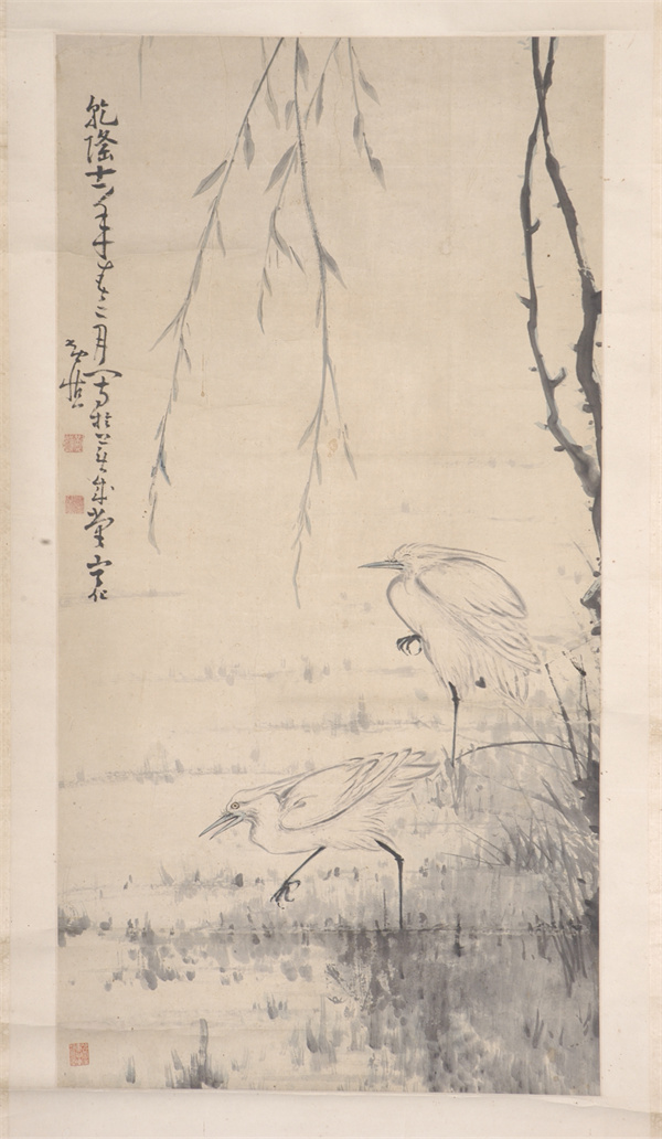 清代,水墨設(shè)色花鳥畫立軸,紙本,作者黃慎??v高1126厘米,橫寬57.4厘米??钍?ldquo;乾隆十一年春二月寫于蕪成堂寧化黃慎”。鈐“黃慎”白文方印,“癭瓢”白文方印。柳枝自畫面上方垂下,疏落的柳葉隨風(fēng)搖曳。池塘兩只白鷺,一只閉目獨立,一只行走覓食。黃慎,福建寧化人,書畫家,為“揚州八怪”之一。