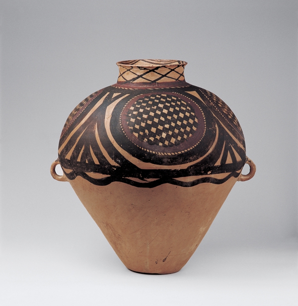 馬廠類型,蘭州市土谷臺出土??趶?3.9厘米,底徑12厘米,高44.5厘米。泥質(zhì)橙黃陶。施黑,紅彩,口內(nèi)繪一圈帶紋和連弧紋,頸部繪菱格紋,肩腹部用黑紅兩色繪二方連續(xù)的四大圓圈紋,圓圈內(nèi)填方格紋。腹中部繪黑色帶紋和一圈水波紋。四大圓圈紋,顯示了馬廠類型彩陶的獨特文化風(fēng)格。