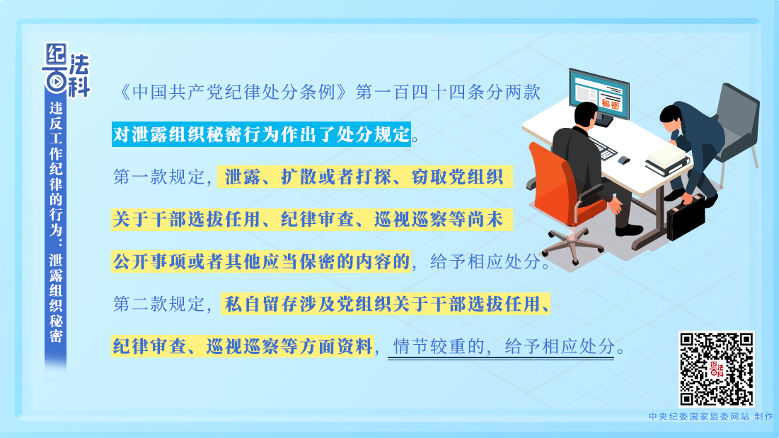 “嚴(yán)守黨的紀(jì)律,保守黨的秘密”,是每名黨員入黨宣誓時的鄭重承諾。無論選人用人工作、紀(jì)律審查工作,還是巡視巡察等工作,都有嚴(yán)格的保密紀(jì)律?!饵h政領(lǐng)導(dǎo)干部選拔任用工作條例》規(guī)定,選拔任用黨政領(lǐng)導(dǎo)干部,不準(zhǔn)私自泄露研判、動議、民主推薦、民主測評、考察、醞釀、討論決定干部等有關(guān)情況?!吨袊伯a(chǎn)黨紀(jì)律檢查機(jī)關(guān)監(jiān)督執(zhí)紀(jì)工作規(guī)則》規(guī)定,監(jiān)督執(zhí)紀(jì)人員不準(zhǔn)私自留存問題線索和涉案資料,嚴(yán)禁泄露審查調(diào)查工作情況,對紀(jì)檢干部私存線索、跑風(fēng)漏氣、違反安全保密規(guī)定等違紀(jì)行為要嚴(yán)肅處理。《中國共產(chǎn)黨巡視工作條例》規(guī)定,巡視工作人員私自留存巡視工作資料,泄露與巡視工作有關(guān)的未公開信息的,要給予處理處分。
