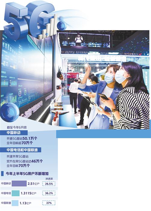 從5G基站看,截至今年6月底,中國移動(dòng)已開通5G基站50.1萬個(gè),全年目標(biāo)超過70萬個(gè);中國電信和中國聯(lián)通共建共享5G基站,目前雙方在用5G基站達(dá)46萬個(gè),全年目標(biāo)也是70萬個(gè)。工信部數(shù)據(jù)顯示,截至今年6月底,我國累計(jì)建設(shè)5G基站96.1萬個(gè),覆蓋全國所有地級(jí)以上城市,5G手機(jī)終端連接數(shù)達(dá)3.65億戶,占全球80%以上。