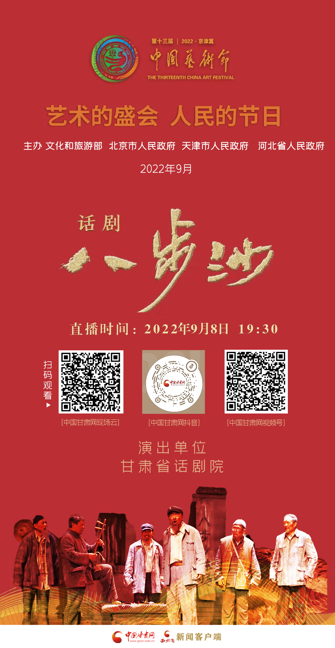 第十三屆中國藝術(shù)節(jié)參演劇目話劇《八步沙》, 角逐第十七屆文華獎 今晚19:30演出 中國甘肅網(wǎng)將進行現(xiàn)場直播