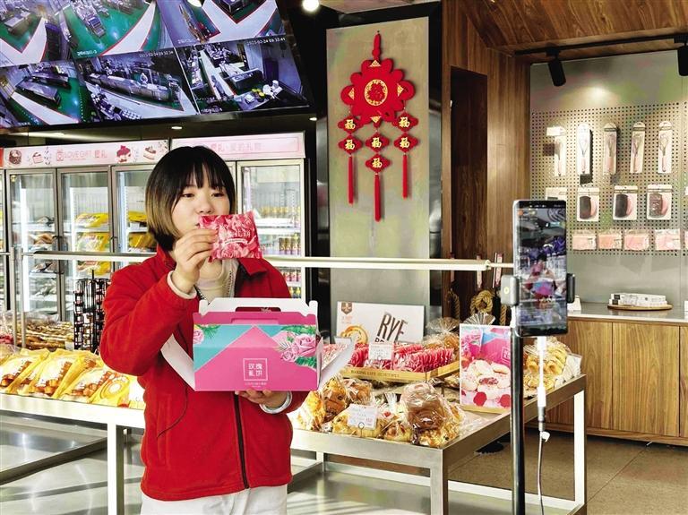 “第一次走進直播間的粉絲一定要入手玫瑰禮餅,它是采用蘭州苦水玫瑰制作的……”每天上午,位于九州中路的愛禮烘焙生活工廠店內(nèi)一角,工作人員都在直播售貨。剛走進店里就能聞到撲鼻而來的糕點香味,琳瑯滿目的商品讓人應接不暇。