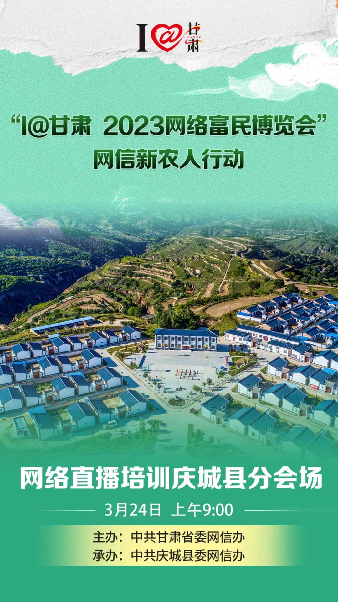 甘肅省委網信辦“I@甘肅 2023網絡網絡富民博覽會”網信新農人行動第4場網絡主播培訓班,將于3月24日在慶陽市慶城縣舉辦