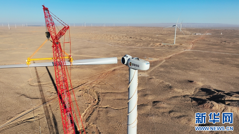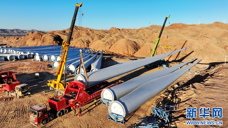 隆冬季節(jié),在甘肅省張掖市甘州區(qū)平山湖風電基地國家電投10萬千瓦風電項目建設(shè)工地,工人正在進行風機葉片吊裝作業(yè)。