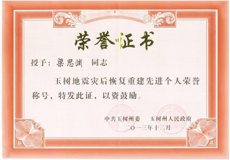 他一直這樣嚴(yán)于要求自己。因在格薩爾王賓館地震遺址維修保護(hù)項目中作出突出貢獻(xiàn),梁思淵被玉樹州委、州政府評為“玉樹地震災(zāi)后恢復(fù)重建先進(jìn)個人”。疫情期間,他主動請纓,參與雁南路街道防疫物資運輸保障任務(wù),轉(zhuǎn)運物資總計150多趟次。