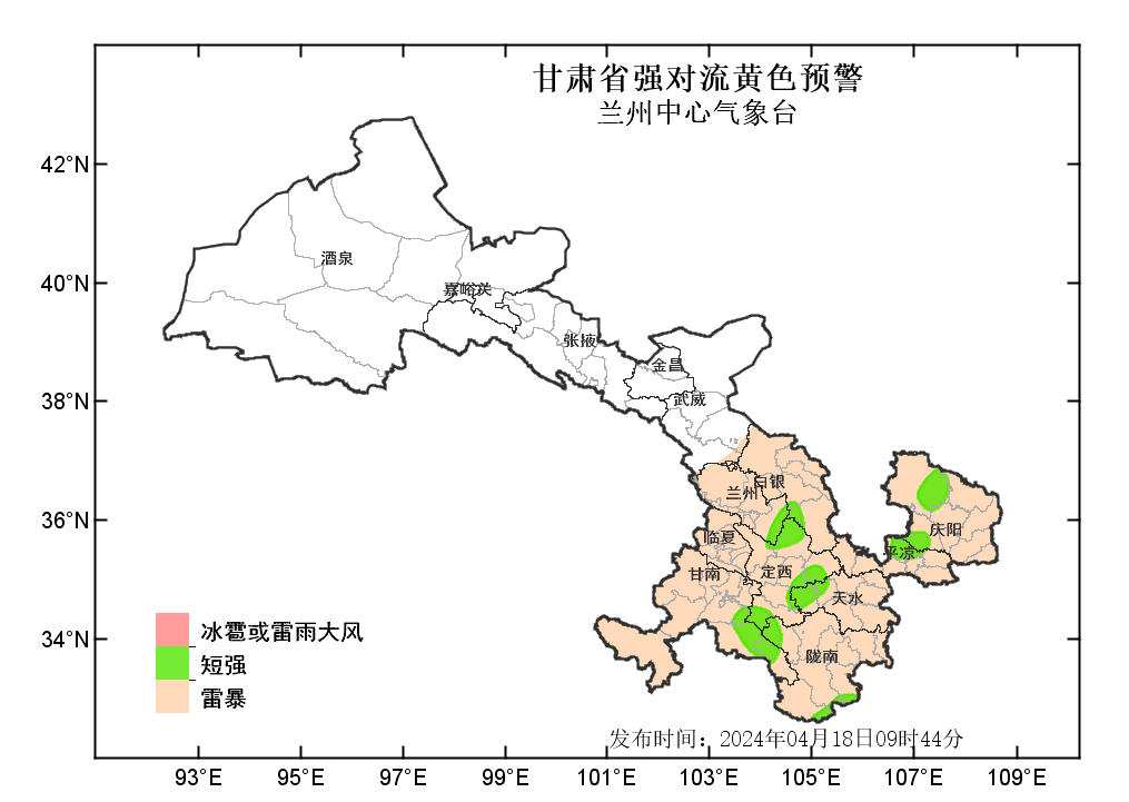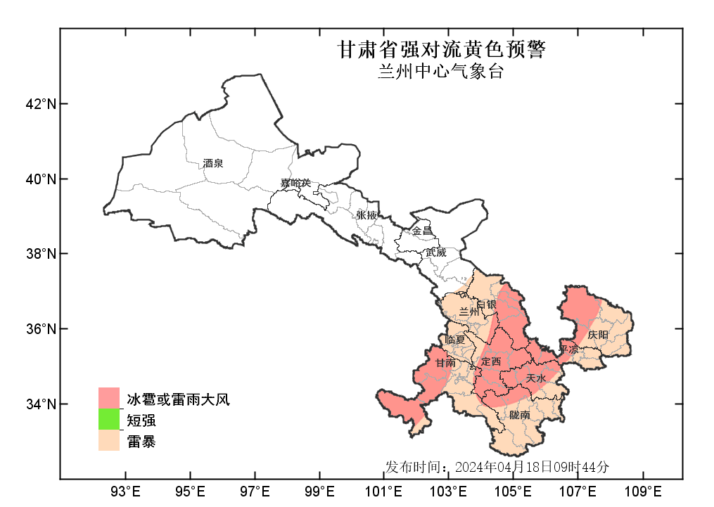 中國甘肅網(wǎng)4月18日訊(西北角·中國甘肅網(wǎng)記者 沈文剛)4月18日9時44分,蘭州中心氣象臺發(fā)布強對流黃色預(yù)警:預(yù)計今天白天到夜間,武威以東大部分地方有雷暴;其中,白銀、定西、甘南、天水等市州部分地方及蘭州、隴南、平?jīng)?、慶陽等市局部地方有雷雨大風(fēng)或冰雹;甘南、隴南、定西、天水、白銀、蘭州、平?jīng)?、慶陽等州市局部地方有短時強降水,最大小時雨強為20-30毫米。