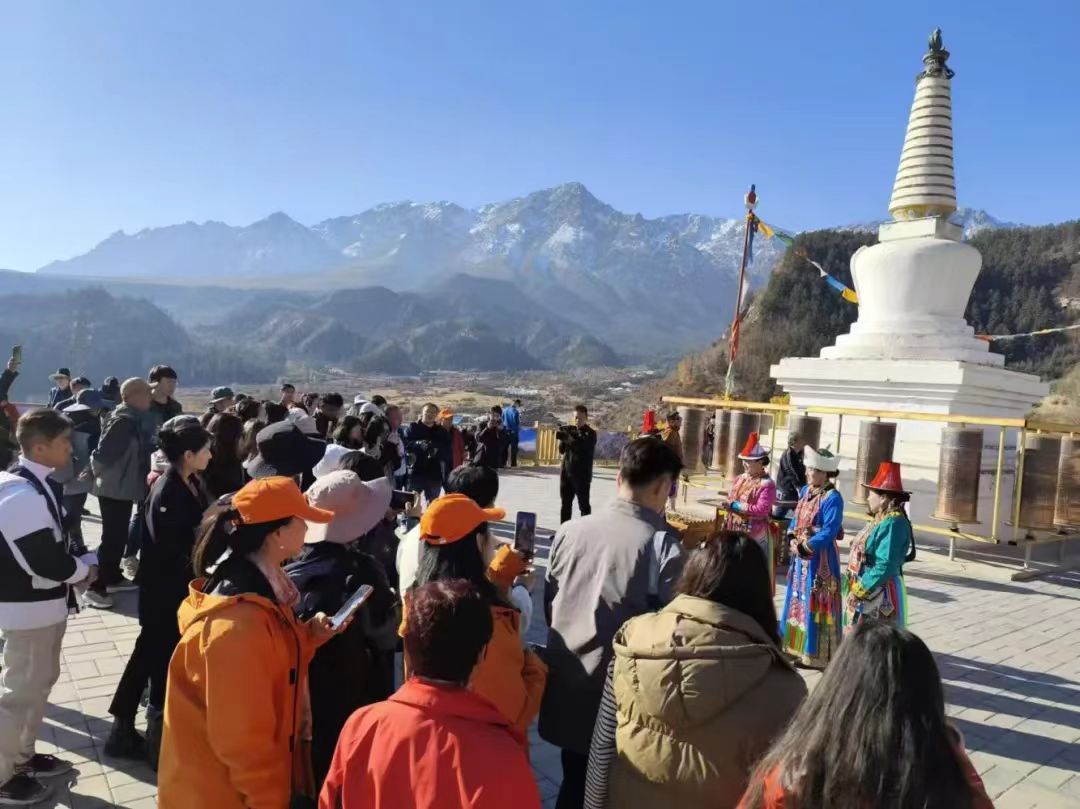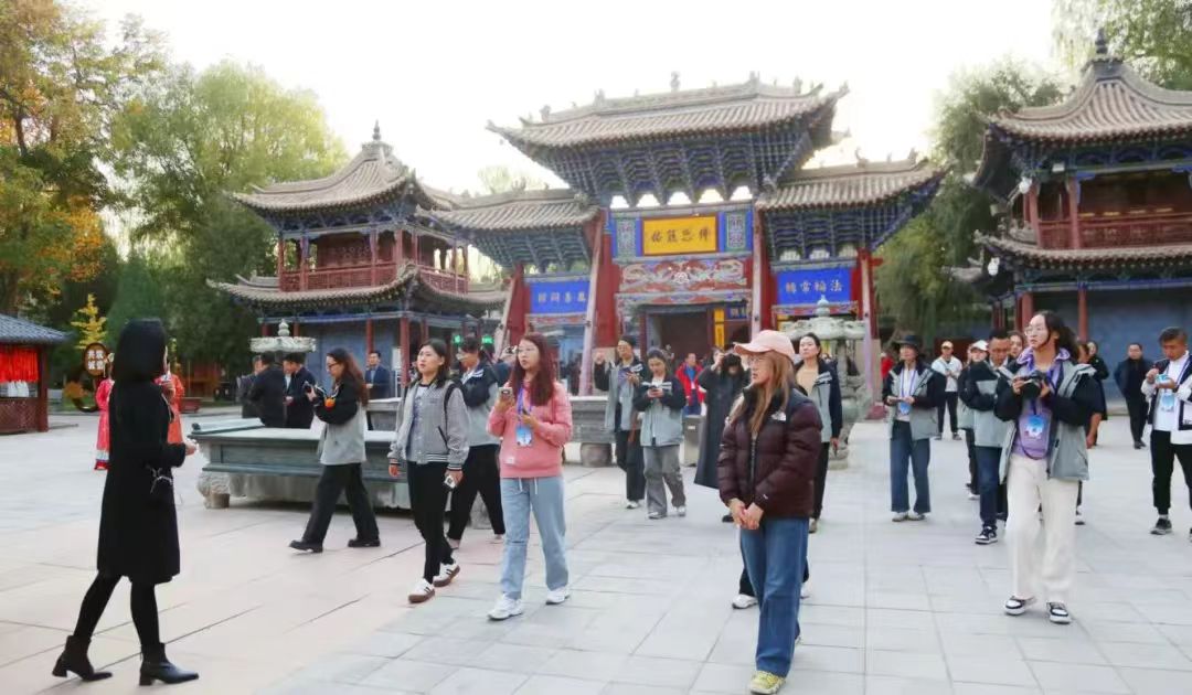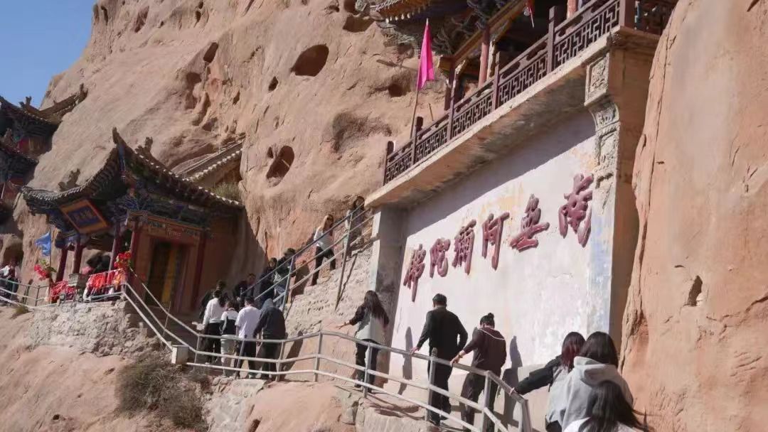 18日上午,迎著耀眼的晨光,采訪團成員乘坐大巴車來到了集自然風光、石窟藝術(shù)、民族風情、宗教文化于一體的肅南馬蹄寺。馬蹄寺是河西走廊著名的佛教勝地,石窟群開鑿于十六國北涼時期,距今約1600年的歷史,是絲綢之路上至關(guān)重要的歷史文化瑰寶,也是我國早期石窟的杰出代表。秋日的馬蹄寺,秋高氣爽,景色宜人,遠遠看去,紅綠相間,層林盡染,大家行走在落葉飄零的山間小路上,對這座建在懸崖峭壁之上、將棧道鑲嵌在山體之內(nèi)的石窟充滿了好奇。