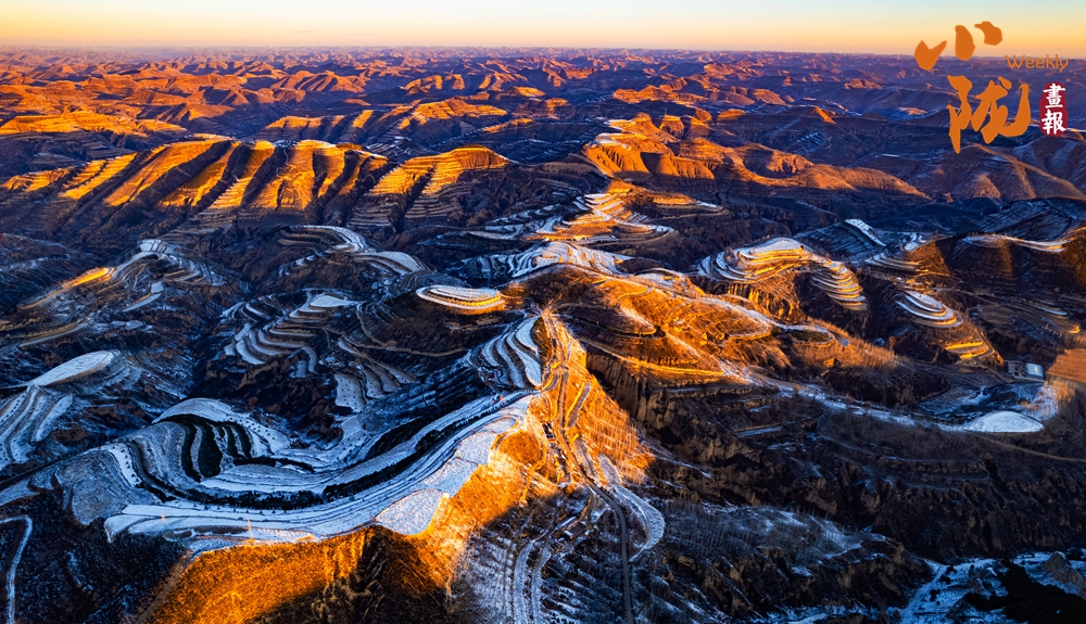 俯瞰雪后華池,溝壑縱橫的黃土高原披上銀裝,陽光斜照雪野之上,投下深淺交錯的光影,靜謐中流轉(zhuǎn)著溫柔的明暗,純凈而遼遠。