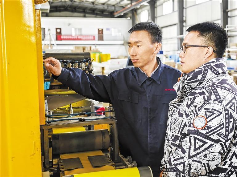 科技專員劉生壽(左)與甘肅盈騰節(jié)能科技有限公司技術(shù)負(fù)責(zé)人趙文強(qiáng)在討論工作。本版圖片攝影:新甘肅·甘肅日?qǐng)?bào)記者 吳涵