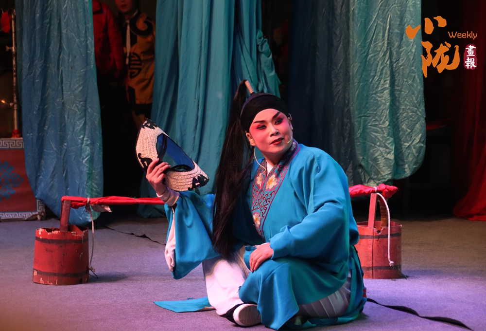 舞臺的藍幕前,一位演員正以跪坐的姿態(tài)投入表演,身著繡著精致紋樣的青藍色戲服,手持折扇,眉眼間滿是戲韻。臺側(cè)的紅色水桶、幕后的隱約人影,讓這充滿程式化的舞臺瞬間多了幾分鄉(xiāng)土演出的真實感。