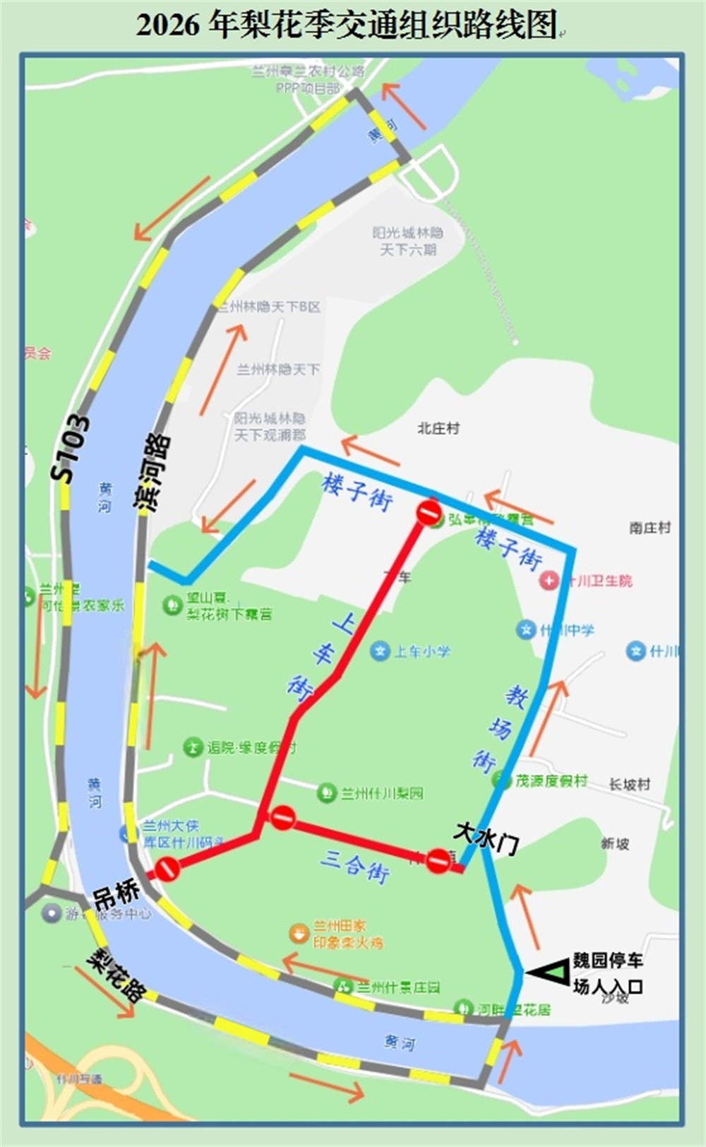 什川古梨園百年古梨樹枝繁葉茂,春日梨花滿枝、如雪似霞,每年梨花節(jié)都是市民游客春日打卡的熱門目的地。為應(yīng)對(duì)節(jié)日期間的車流高峰,皋蘭縣政府聯(lián)合縣公安局及各相關(guān)部門,制定了科學(xué)的交通組織方案,并繪制了2026年梨花季交通組織路線圖,明確了景區(qū)內(nèi)外循環(huán)通行規(guī)則與停車區(qū)域。