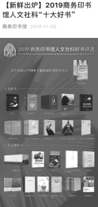 “商務印書館人文社科好書評選”被中央電視臺等媒體稱為“年度圖書榜單風向標”。每每公布后,央媒及主流媒體都會予以報道,同時在新媒體平臺也會進行系列宣傳,比如2019年的好書評選人民日報官方微信發(fā)布后一天內的閱讀量便超過了888萬。