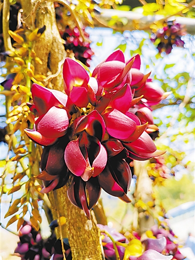 我終于登上山巔,來到那個罕見的常春油麻藤家族旁邊,眼前的景象,比我想象的更震撼。傷痕累累的蒼勁老藤猶如飛龍騰空而起,盤旋而上。只是,眼前的飛龍,是一條掛滿鮮花的飛龍。成千上萬的花朵,密密麻麻包裹著幾根老藤,每一朵,都像是紫色的飛鳥。這些花不是同時開放的:最早的已經(jīng)掉在地上,就像一群小鳥落地休息;更晚的還沒有吐出花蕊,像是巢中幼鳥,還在閉眼做夢;數(shù)量最多的,正迎風(fēng)怒放,雖然是陰天,但透進樹林的弱光,讓它們格外明亮。