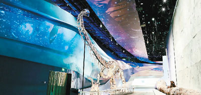 進(jìn)入展廳,人們首先會(huì)被來(lái)自侏羅紀(jì)時(shí)代的龐然大物——中加馬門(mén)溪龍化石所震撼。馬門(mén)溪龍是中國(guó)發(fā)現(xiàn)的體型最大的蜥腳類恐龍之一,頸部特別長(zhǎng)。這具化石出土于新疆奇臺(tái)縣,2016年修復(fù)裝架完成,高7.5米,長(zhǎng)24米,脖子就有12米長(zhǎng)。