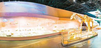 武漢自然博物館展示的中加馬門(mén)溪龍化石、硅化木和“龍”足跡化石墻。 本文圖片均由長(zhǎng)江文明館(武漢自然博物館)提供