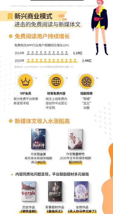 而在近年,免費(fèi)閱讀和新媒體文成為新興商業(yè)模式,得到快速發(fā)展。其中,免費(fèi)閱讀和新媒體文激活了下沉市場,成為刺激數(shù)字閱讀市場快速發(fā)展的新興力量,為網(wǎng)絡(luò)文學(xué)的內(nèi)容和用戶帶來新增量,也拓寬了網(wǎng)絡(luò)文學(xué)市場規(guī)模。