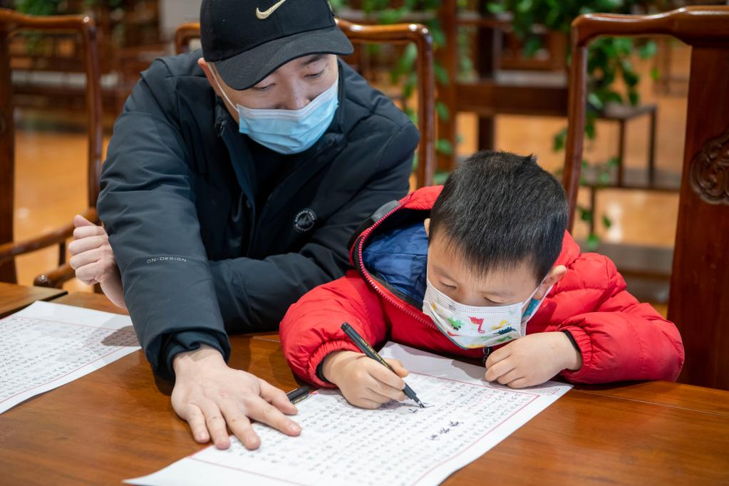 2月6日,小朋友和家長在太原市圖書館參加“觀四庫 抄經(jīng)典”活動。