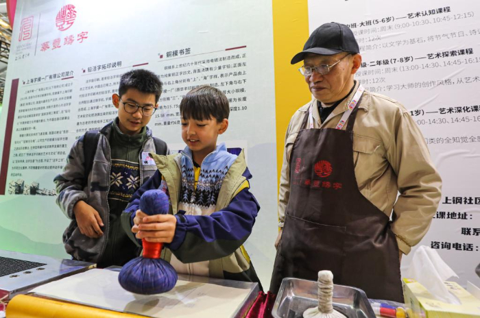 11月17日,參觀者在第十屆中國上海國際童書展現(xiàn)場體驗活字印刷。