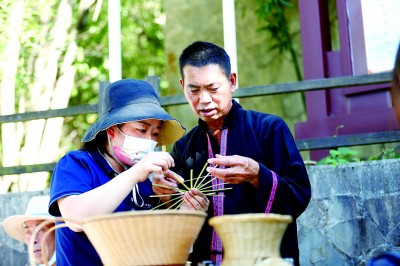 胡長(zhǎng)心向游客介紹五峰竹編技藝。鄭兵攝
