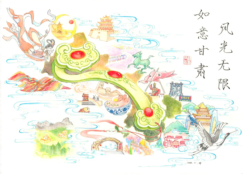 筆者作為編者之一,在一開始接觸到“如意甘肅”這個概念時,就感受到了一種撲面而來的畫面感和強烈的色彩張力,而在精讀《如意甘肅》的過程中,這種感覺愈發(fā)清晰和強烈,一幅黃土高原、廣袤草原、茫茫戈壁、潔白冰川為底色,十四個市州的人文自然美景簇擁環(huán)繞,一柄通體翠綠、晶瑩無瑕的“玉如意”居中凝型,璀璨奪目的文化如點點紅寶石鑲嵌其中的構圖呼之欲出。隨著理解認識的逐步深入,本書喚起了我的思想共鳴和對家鄉(xiāng)深沉熱烈的情感流動,并繪制了這幅印象畫,以填補文字和語言所不能盡興之處。我真切地希望,隨著《如意甘肅·甘肅省情研究》的發(fā)行和推廣,隨著美好甘肅的不斷發(fā)展和進步,在未來,人們心中的甘肅,不再是“苦瘠甲于天下”的荒涼意象,而是這柄溫潤澄澈、莊重堅實的“玉如意”,和圍繞著、托舉著它的那些繽紛美景和璀璨文化!
