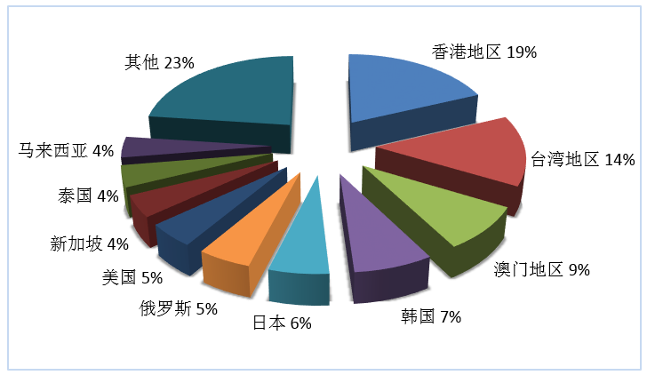 第三季度旅行社入境旅游外聯(lián)人次排名前十位的客源地國家或地區(qū)由高到低依次為香港地區(qū)、臺灣地區(qū)、澳門地區(qū)、韓國、日本、俄羅斯、美國、新加坡、泰國、馬來西亞(見圖1)。