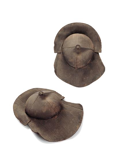 先看前加沿笠帽,大家看是不是有些眼熟?沒錯(cuò),這頂帽子與影視劇中英雄俠客們所戴的帽子很相似,《神探狄仁杰》里的李元芳、《水滸》中的林沖外出時(shí)就戴類似的帽子。為什么要戴這樣的加沿笠帽呢?為了遮光啊。別小瞧這頂前加沿笠帽,它的背后還有一段歷史故事呢:相傳元世祖忽必烈騎馬射獵時(shí)覺得日光太過炫目,聰慧體貼的皇后便為他設(shè)計(jì)了這種前面加沿的帽子,戴這種加沿帽遮光效果就好多了,忽必烈非常喜歡,便將這種式樣固定了下來,以后國人紛紛效仿,成為流行款式??墒牵扑问窃谠?,元芳和林沖似乎不該戴類似的帽子?既是藝術(shù)形象,就不用深究了吧。人類智慧相通,英雄更是惺惺相惜,既都是英雄,戴上同款的帽子也是應(yīng)有之義。