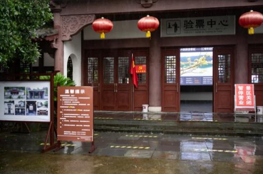 受持續(xù)強(qiáng)降雨影響,婺源江灣景區(qū)入口豎立起了“景區(qū)關(guān)閉、暫停營(yíng)業(yè)”的提示牌