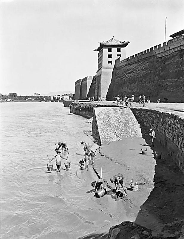 第二張是水客子在黃河中取水的情形。看起來(lái),似乎是黃河大水之后,人們從河中取水。黃河邊的石堤下,堆積的淤泥,還沒有清理。以前,蘭州城墻的位置,就是今天的南濱河路。從淤泥堆積的高度看,這次黃河大水應(yīng)該不小。