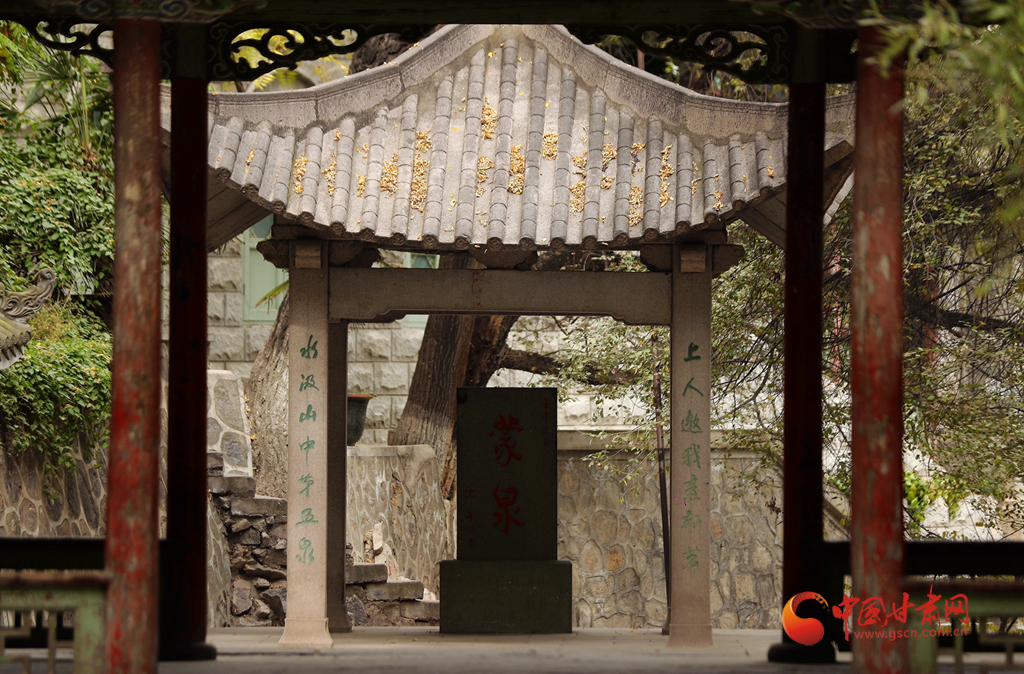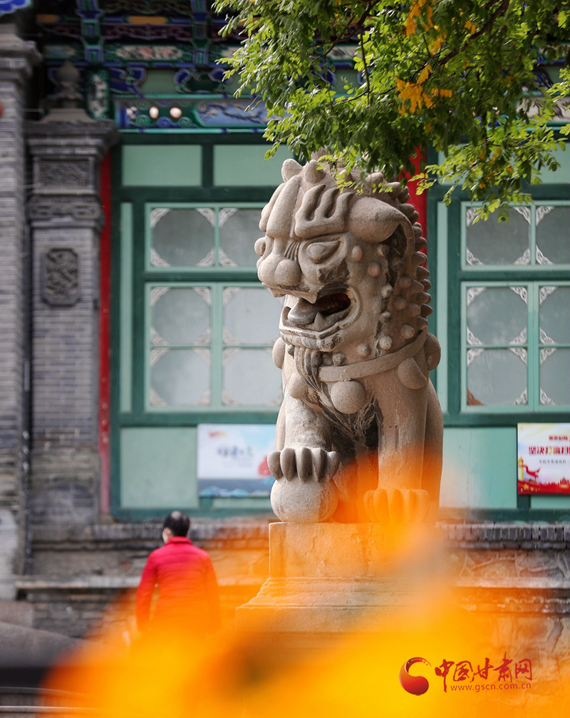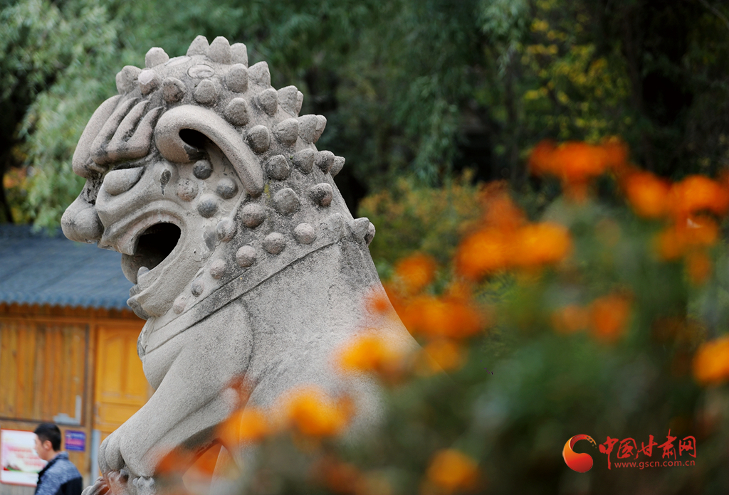 秋天,石獅子和金黃色構成五泉山的一道景致。