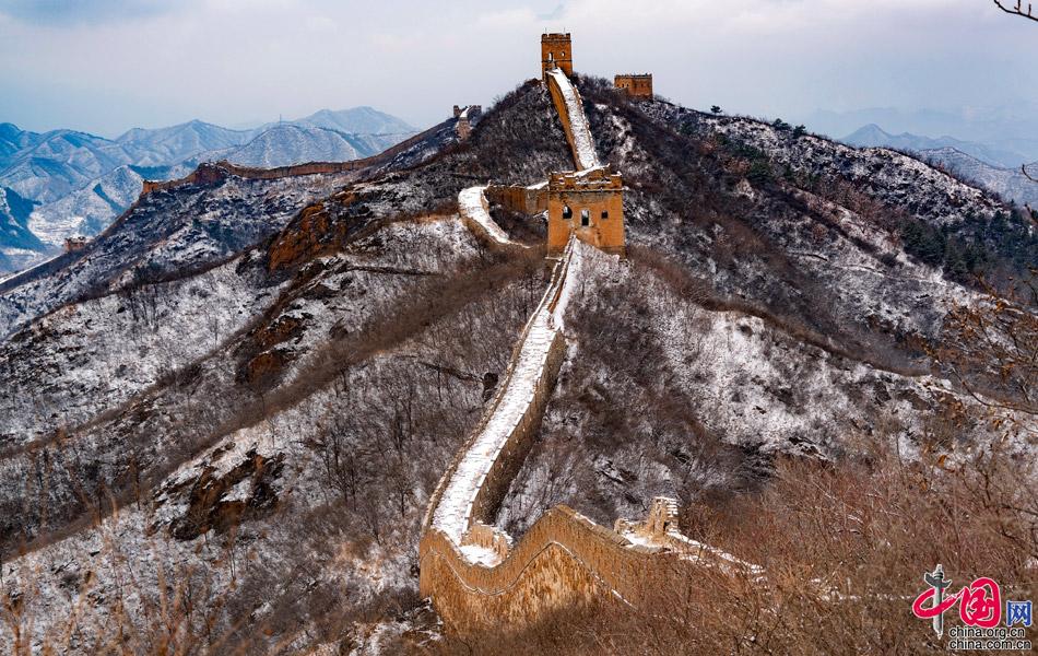 在春雪覆蓋下,山巒起伏,壯觀的長(zhǎng)城在崇山峻嶺之巔如巨龍飛舞,一幅雪墨丹青,令人向往。