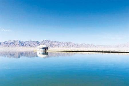 放眼望去,只見那清澈見底的湖水,像一塊純潔無瑕的碧玉,又如一位溫婉的少女,她那婀娜多姿的身影,在這片黃沙浩瀚的大漠中顯得尤為美麗動人,給沙漠和綠洲增添了迷人的光彩,給寂靜的大漠帶來無限生機,也給來這里的游人們一個驚嘆,平添許多感慨和眷戀。沿曲折回環(huán)的青石板路拾級而上,是開闊的沙棗林地,林地周圍,偶見農(nóng)舍菜圃,點綴其間,一幅世外桃源的悠閑景觀。