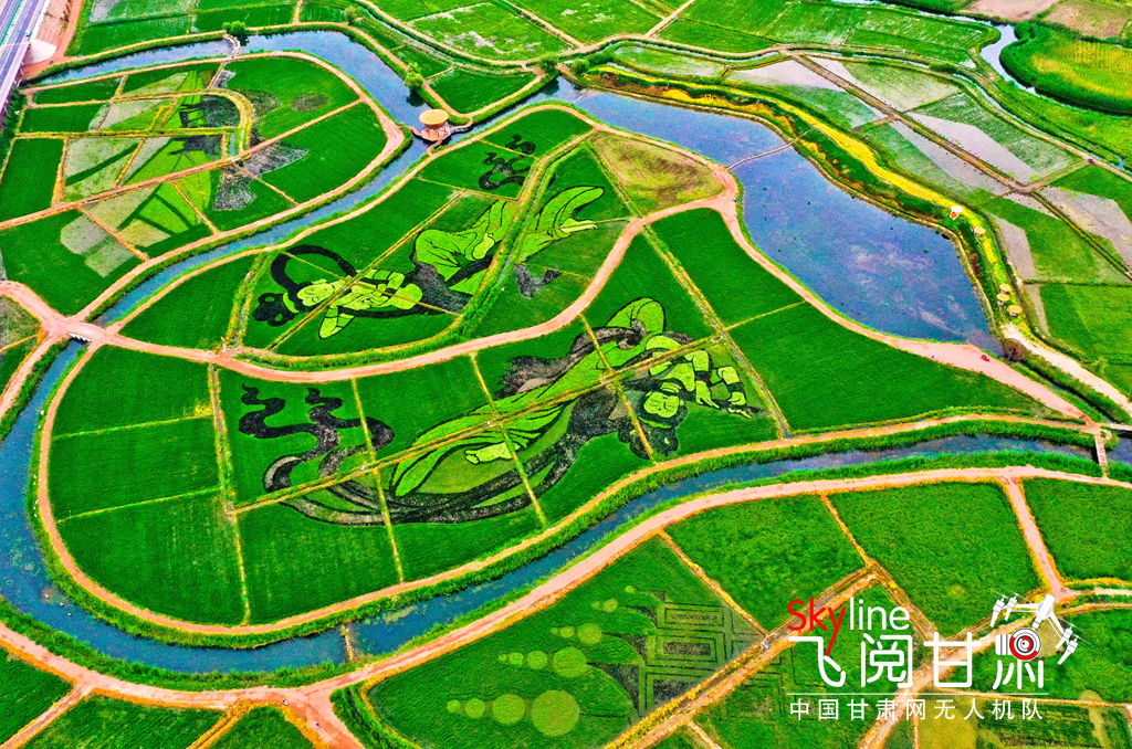 7月13日清晨,一場小雨過后,張掖市甘州區(qū)烏江鎮(zhèn)新河田園綜合體稻田景觀區(qū)內2000多畝稻田塵埃盡洗,一幅幅彩稻畫栩栩如生,從高處俯瞰,田園風光和生態(tài)美景展現(xiàn)在人們眼前。