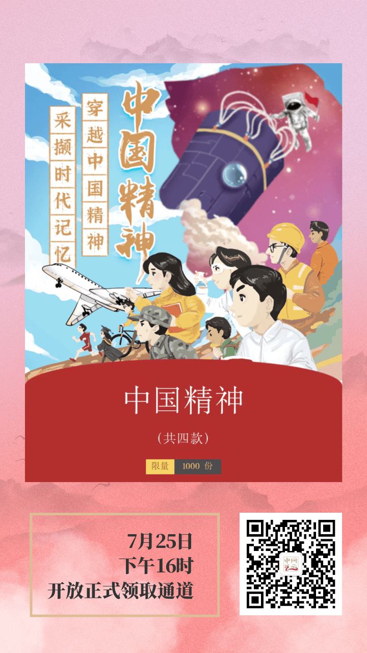 7月25日下午16時,中國網(wǎng)旗下中網(wǎng)藝云數(shù)字藏品平臺發(fā)布上線首批藏品并將開放正式領(lǐng)取通道,大眾通過中網(wǎng)藝云線上渠道可對《中國精神》系列藏品進(jìn)行免費(fèi)領(lǐng)取。本期藏品總數(shù)量1000份,共四款,全部用于免費(fèi)發(fā)行。其中歷史主動精神400份、首創(chuàng)精神300份、航空強(qiáng)國精神200份、抗疫精神100份,采取“盲盒玩法”隨機(jī)獲取。