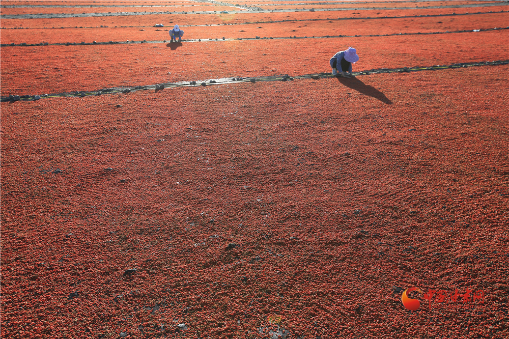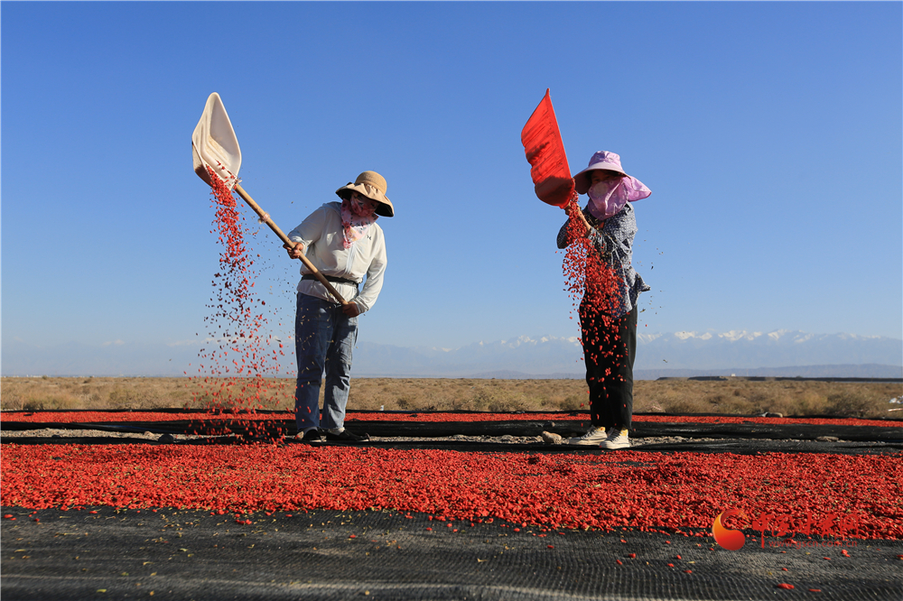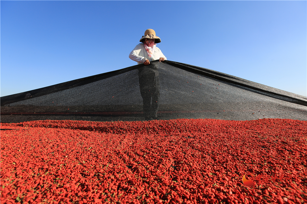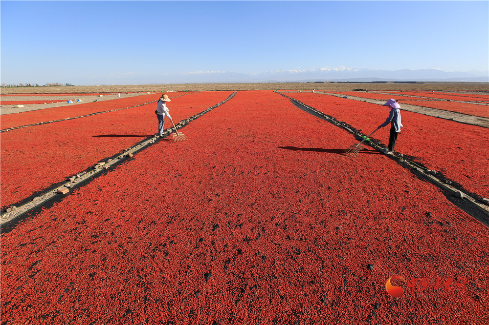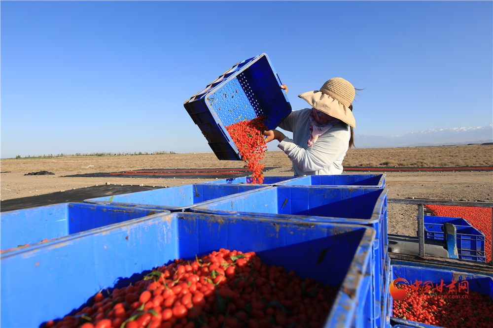 7月22日,在甘肅省嘉峪關(guān)市枸杞喜獲豐收,枸杞種植戶們搶抓雨后晴好天氣采摘、拉運、晾曬、儲存,確保顆粒歸倉。