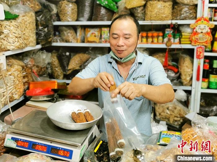 資料圖為廣東臺山富城市場內(nèi),一藥材檔的老板為顧客用密實(shí)袋打包參絲。 中新社發(fā) 李曉春 攝
