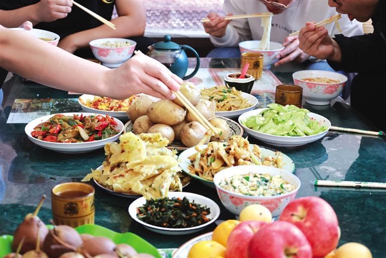 金萬(wàn)裕今年77歲,留著山羊須,筋骨強(qiáng)健,精神矍鑠。他家有21畝地,洋芋今年就種了10畝。當(dāng)天,是他家挖洋芋的第二天,孫子挖,金萬(wàn)裕撿。這里的紅洋芋,淀粉含量高,秧有半人之高。臨近中午,金萬(wàn)裕邀記者回家吃洋芋。在寬敞透亮的新房子里做客,喜悅的氣氛和一桌洋芋宴足以讓人解饞、解乏,尤其是“破皮襖”(油壺喧)就洋芋菜,簡(jiǎn)直是一絕。種植一直是金家的一份可觀(guān)收入,洋芋、大豆都是盼頭,如今房子住套院,孫子在開(kāi)塔吊,三代人和諧幸福。