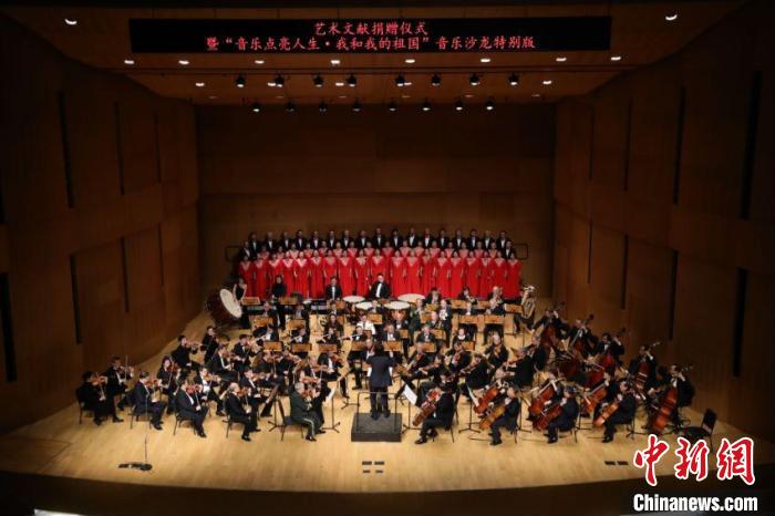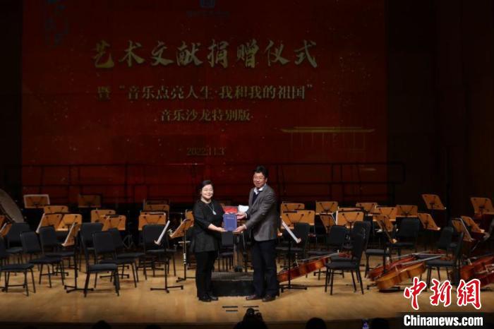 國家圖書館重要藝術(shù)文獻(xiàn)捐贈儀式暨“音樂點亮人生·我和我的祖國——音樂沙龍?zhí)貏e版”活動3日晚在國圖藝術(shù)中心·音樂廳舉辦。國家圖書館黨委書記、副館長魏大威接受捐贈,并為捐贈人代表中央民族歌舞團民樂團團長馬蘭花頒發(fā)捐贈證書。