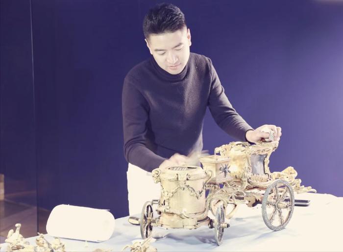 “這件‘魔術(shù)人鐘’功能比較復(fù)雜,經(jīng)過長期開動(dòng)后,出現(xiàn)了一點(diǎn)故障,就存放在了庫房。”亓昊楠說,自己和師父王津一起修復(fù)這座鐘表時(shí),才發(fā)現(xiàn)它的內(nèi)部系統(tǒng)有多精細(xì)。