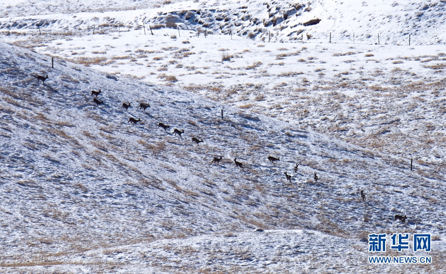 11月12日,一場降雪過后,祁連山國家公園甘肅省張掖市民樂縣境內(nèi)被一層薄薄的白雪覆蓋,成群的野生狍鹿漫步在積雪覆蓋的山坡上。它們時而追逐玩耍,時而靜臥休息,時而覓食充饑,展現(xiàn)出一幅人與自然界和諧共生的畫面。