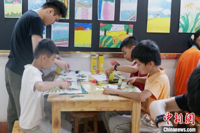 距離村口不遠(yuǎn)處的六禾畫社中,傳來一陣“咚咚”的敲擊聲。屋內(nèi),十幾名孩童手拿小錘子,在白色卡紙上拓印葉片的形狀。